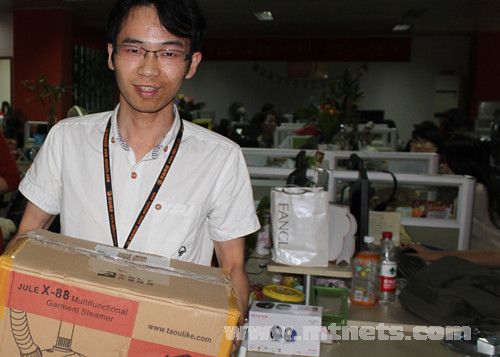 制藥網(wǎng)的毛華不僅業(yè)績佳,運(yùn)氣也不錯(cuò),抽到本期大獎(jiǎng)——掛燙式熨衣機(jī)