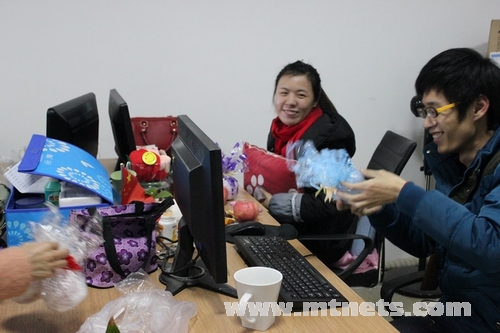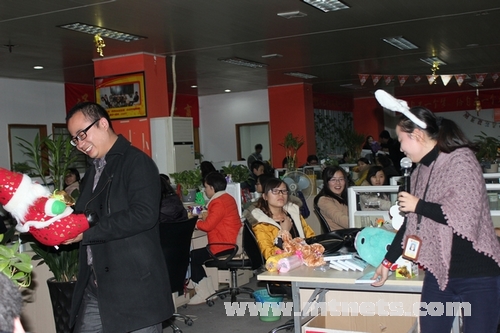 第二波活動是平安夜每個明通人都受到了一個精美包裝的蘋果,公司祝大家來年平平安安,圓圓滿滿。圣誕節當天圣誕老人和兔女郎們閃亮登場,為大家表演了明通版的《江南STYLE》,并為大家派發了襪子,毛絨玩具等各種小禮物。