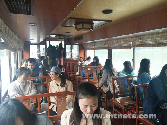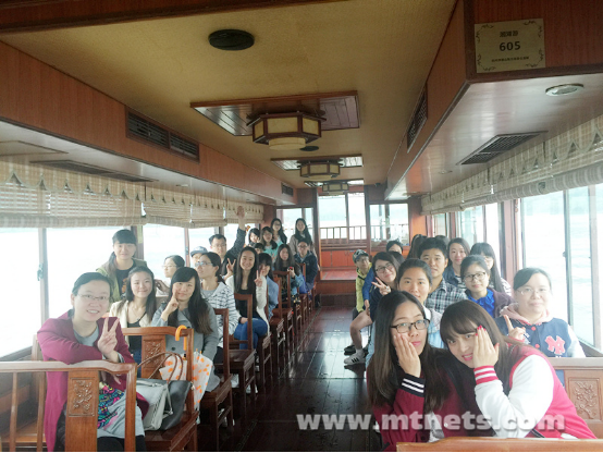 因?yàn)槭怯晏欤庉嫴堪渡系牟叫杏^光,只在下孫文化村附近。在下孫船埠,我們便坐上了一艘大游船,開始長(zhǎng)達(dá)1小時(shí)的環(huán)湖觀景。船上,聽導(dǎo)游介紹著兩岸歷史文化和奇特景觀。