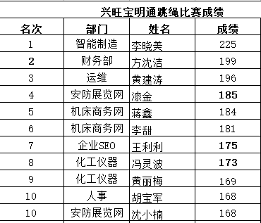 第一名是來自智能制造網的李曉美,一分鐘跳繩成績高達225次,小編看到這兒已經驚呆了,要知道我國一分鐘跳繩最高記錄就是286次,果然天外有天,高手在民間啊。值得一提的是,這位小伙伴也是公司全體參賽人員中唯一突破200個大關的選手,果然就像主持人介紹的那樣,別看人家看著個子小,爆發起來是一鳴驚人,厲害!