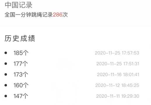 本次跳繩活動中,因為可以不限次數進行跳繩,我們也看到不少小伙伴反復練習、多次嘗試。比如來自安防展覽網的漆金就在1111日到25日期間跳了五次,成績也是不斷地“更上一層樓”,從最初的147個跳到了最后的185個。