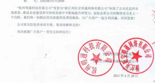 在2011年4月25日至5月9日更名變更期間,如果客戶因各種原因服務(wù)款項(xiàng)達(dá)到杭州明通科技有限公司銀行視為有效,2011年5月10日后必須匯入“浙江興旺寶明通網(wǎng)絡(luò)有限公司”賬戶。