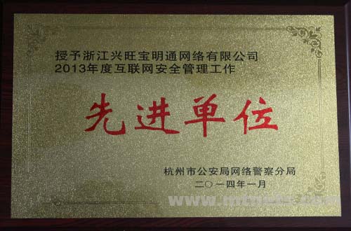 1月7日,2013年杭州互聯(lián)網(wǎng)企業(yè)新春會(huì)暨杭州市網(wǎng)絡(luò)協(xié)會(huì)年會(huì)在杭州召開,會(huì)上表彰了2013年在互聯(lián)網(wǎng)安全管理工作中的先進(jìn)單位和先進(jìn)個(gè)人。會(huì)議上,杭州市公安局網(wǎng)絡(luò)警察分局對(duì)在2013年度中成績(jī)突出的20家單位予以通報(bào)表彰并進(jìn)行授牌,浙江興旺寶明通網(wǎng)絡(luò)有限公司榮獲“2013年度互聯(lián)網(wǎng)安全管理工作先進(jìn)單位”稱號(hào)。