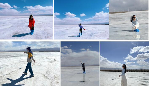 絲綢般輕柔的水面,浸潤著潔白的鹽層,風吹過,波光粼粼,如煙如霧。漫步于擁有“中國天空之鏡”之稱的茶卡鹽湖,好似身處蒼穹,不知道踩著的是湖水中潔白的鹽,還是天空上潔白的云。